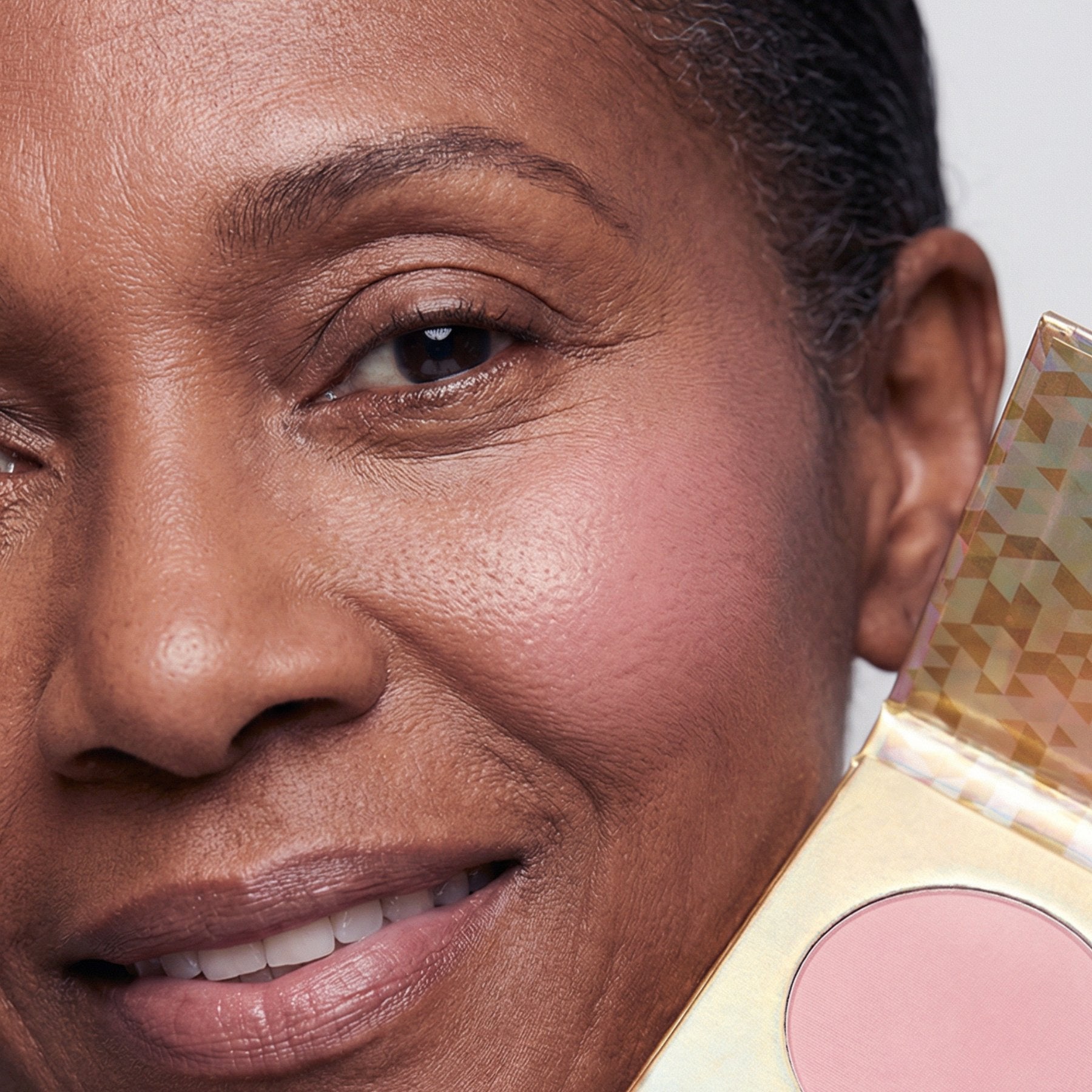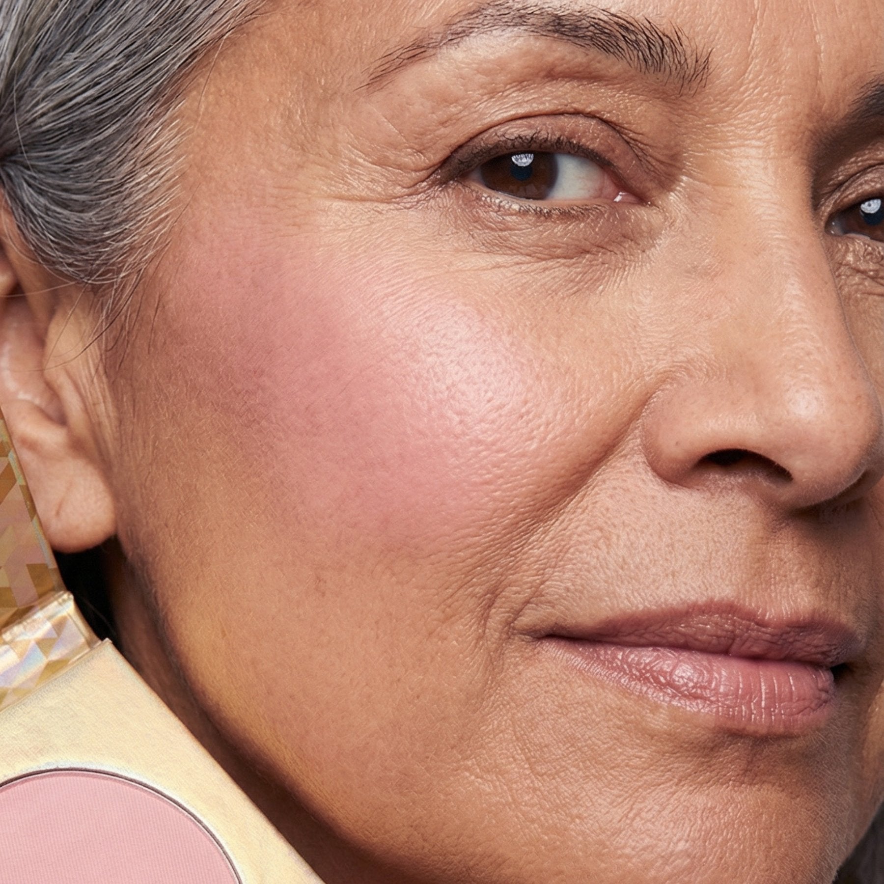 A compact pressed powder blush in a mauve plum shade, presented in a gold-colored case with a geometric pattern.